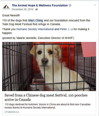After HSI announced the arrival in Canada of the 120 dogs rescued from Yulin. Animal Hope and Wellness sent out a press release basically thanking HSI for giving Marc Ching's rescued dogs a lift to Canada.